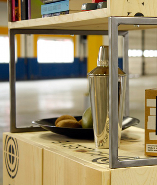 Buffetkast in opdracht gemaakt. Deurtjes en randen planken met mozaïek van BULLSEYE krathout. Frames van staal.